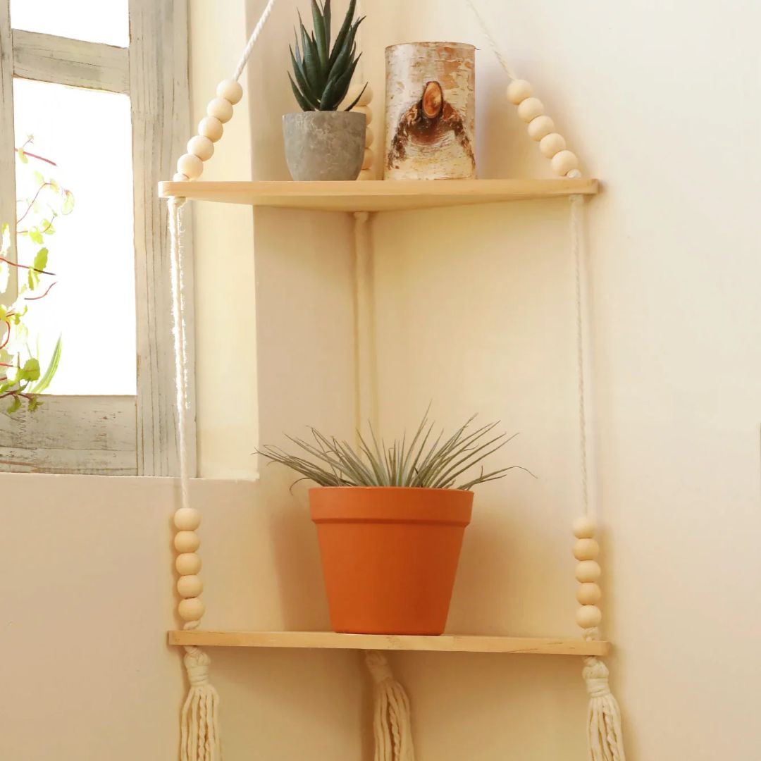 Intégrant harmonieusement la tendance du macramé, cette étagère apportera une atmosphère chaleureuse et naturelle à n'importe quelle pièce.