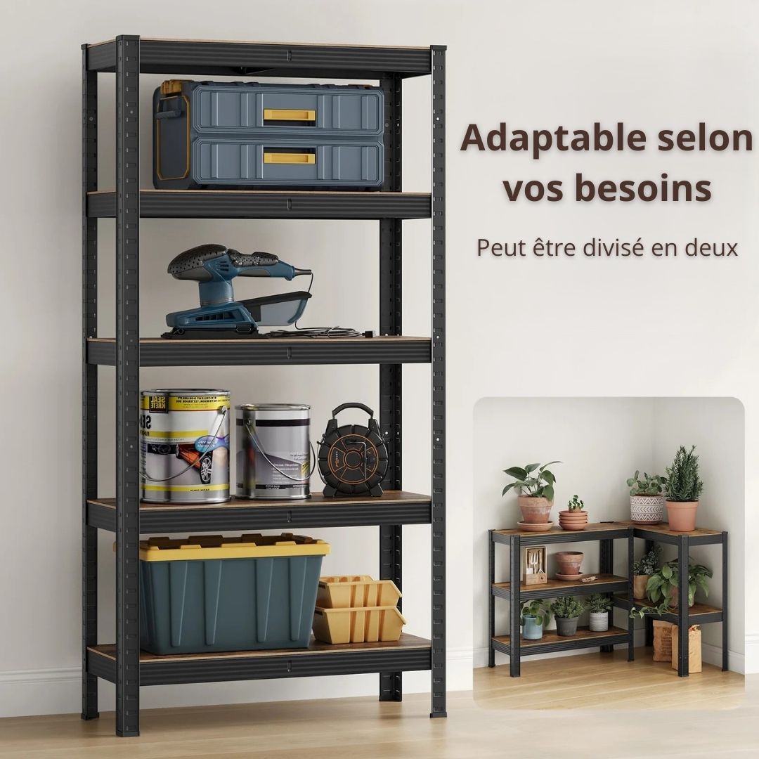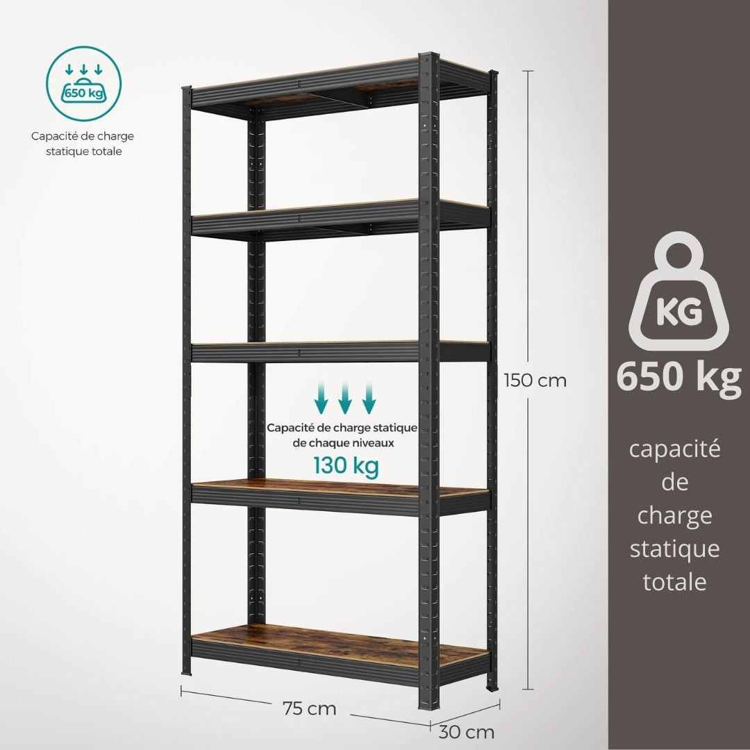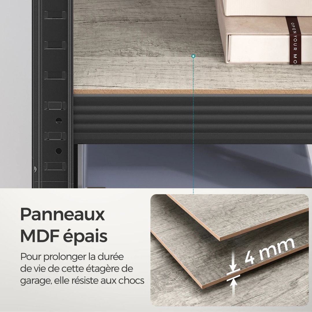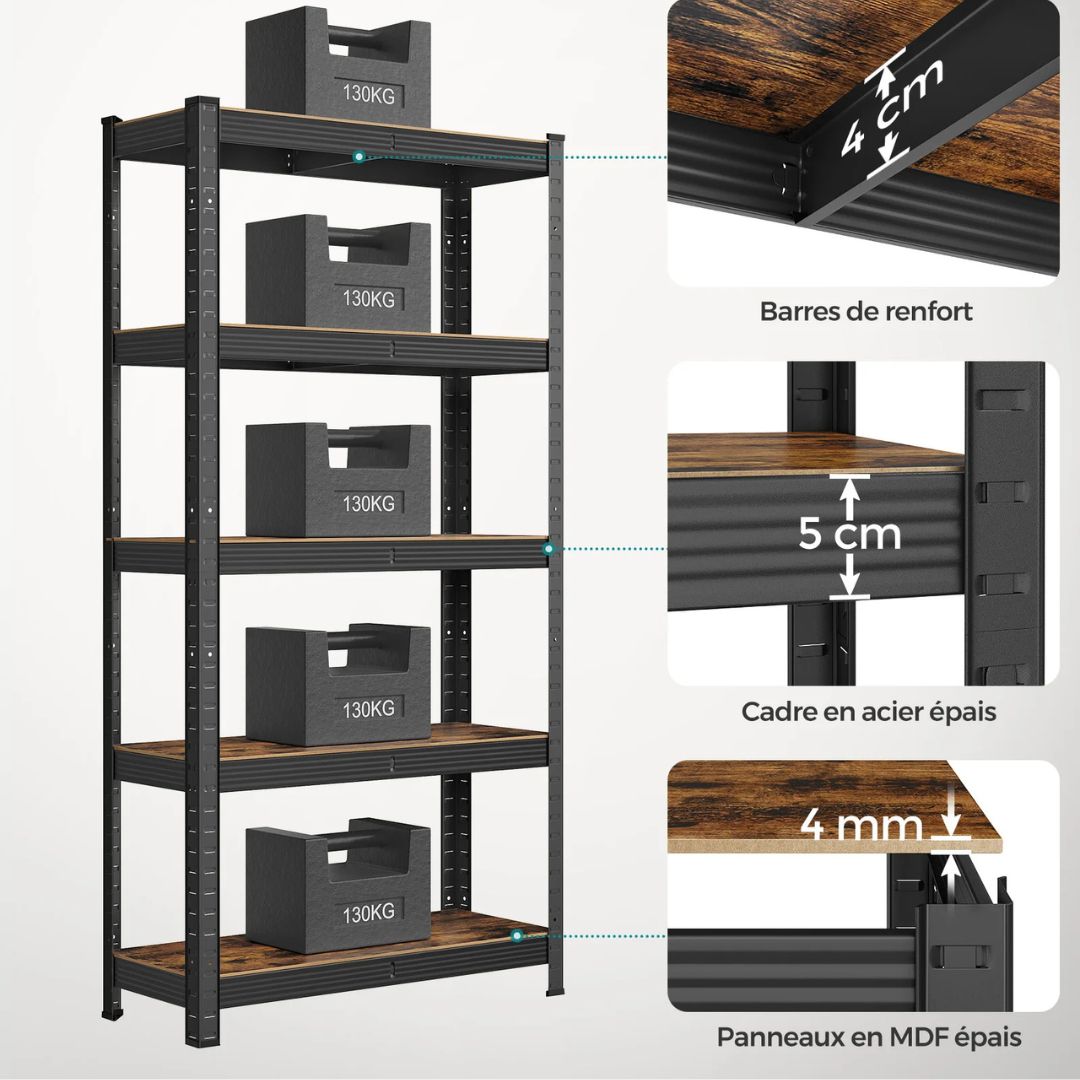 - Matériaux: cadre en acier renforcé, étagères en panneaux MDF